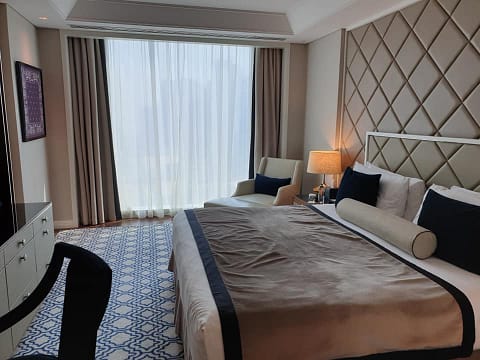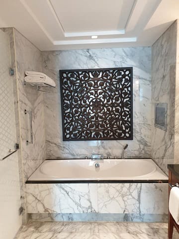 Next, I spent 2 nights at the ultra-luxurious Taj Dubai situated in the Business Bay district. I was absolutely blown away by the service and accommodations here. From entry into the hotel, being greeted with flowers and a drink, then moving to the multi-room suite with ceiling to floor windows in the living area overlooking the famous Burj Khalifa, I couldn’t have asked for a better stay. The luxury suite came with butler service who took care of ordering my morning breakfasts, etc. However, due to the pandemic I never actually saw the butler as he never came to the room to ensure privacy and cleanliness, with