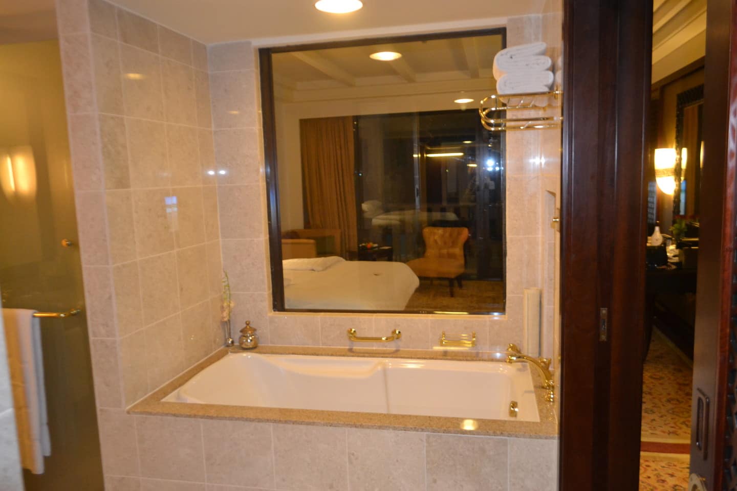 The reservations manager escorted us to our room and explained details of the amenities that Al Husn offers, such as breakfast servings times from 6:30am to 11:00am, the complimentary afternoon tea which is served daily and the pre-dinner drinks that are served from 6pm to 7pm in the Al Husn Lobby Terrace. Upon entry of the suite I was pleasantly delighted by the amazing full length deep seat bathtub, the window that opens from the bath area to the bedroom and then the fantastic view of the infinity pool and beach. It really doesn’t get much better than that at a 5 star resort such as Shangri-La Oman ;-).