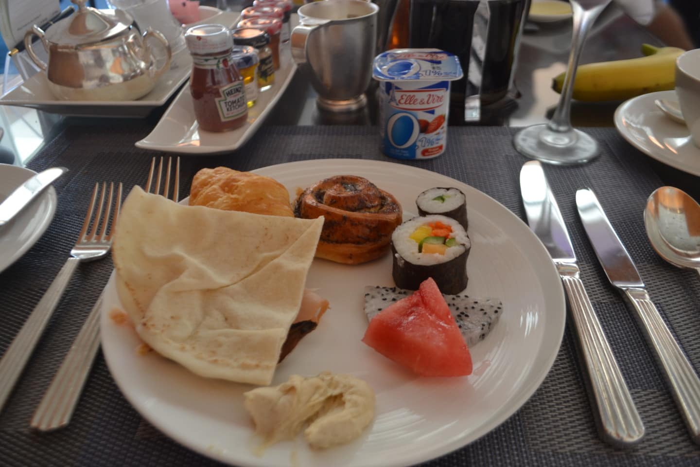 After taking a rest the first night in the comfortable bed with down bedding and huge cozy pillows, it was nice to wake up to the day view of this fabulous pool and the beach out front. I couldn’t wait to dine on the full course buffet breakfast so I could head to the pool for a dip afterwards. The spread was great with options for various backgrounds including sushi, cold cuts, loads of breads, fruits and a salad bar. If you would like some of the traditional continental breakfast options like an omelette, eggs Benedict or pancakes, this has to be ordered off of the a la carte menu, but no worries these were included in the complimentary buffet prices.