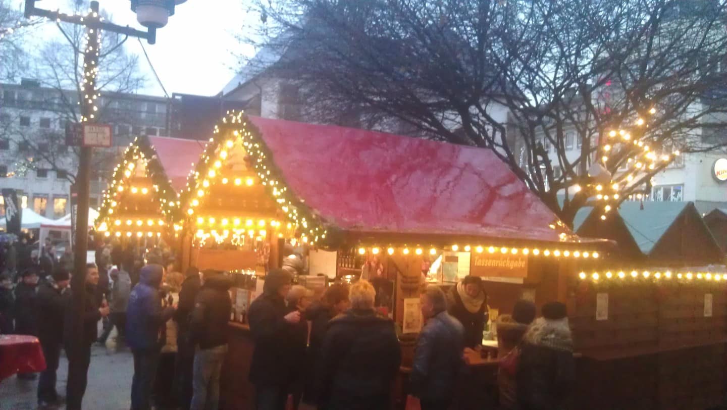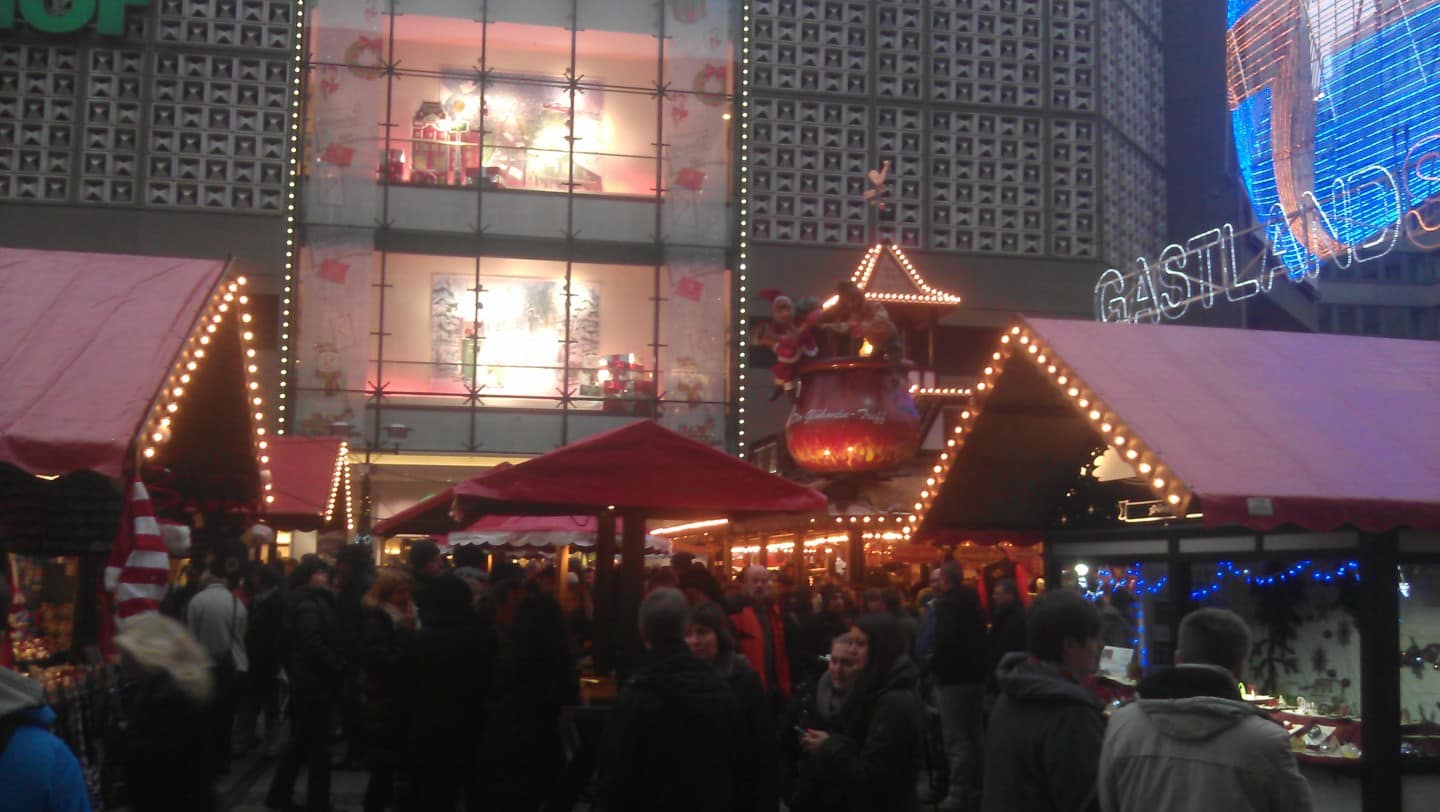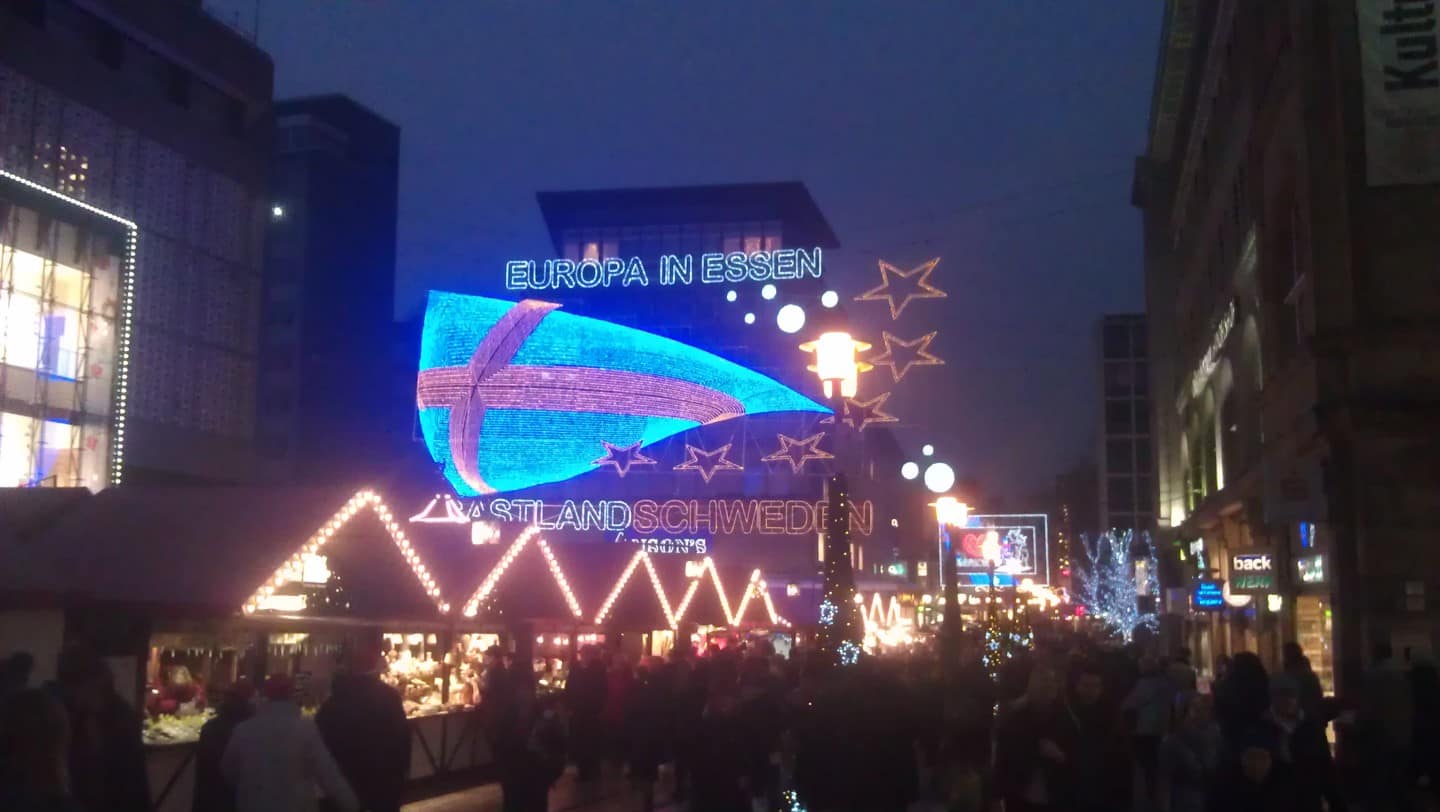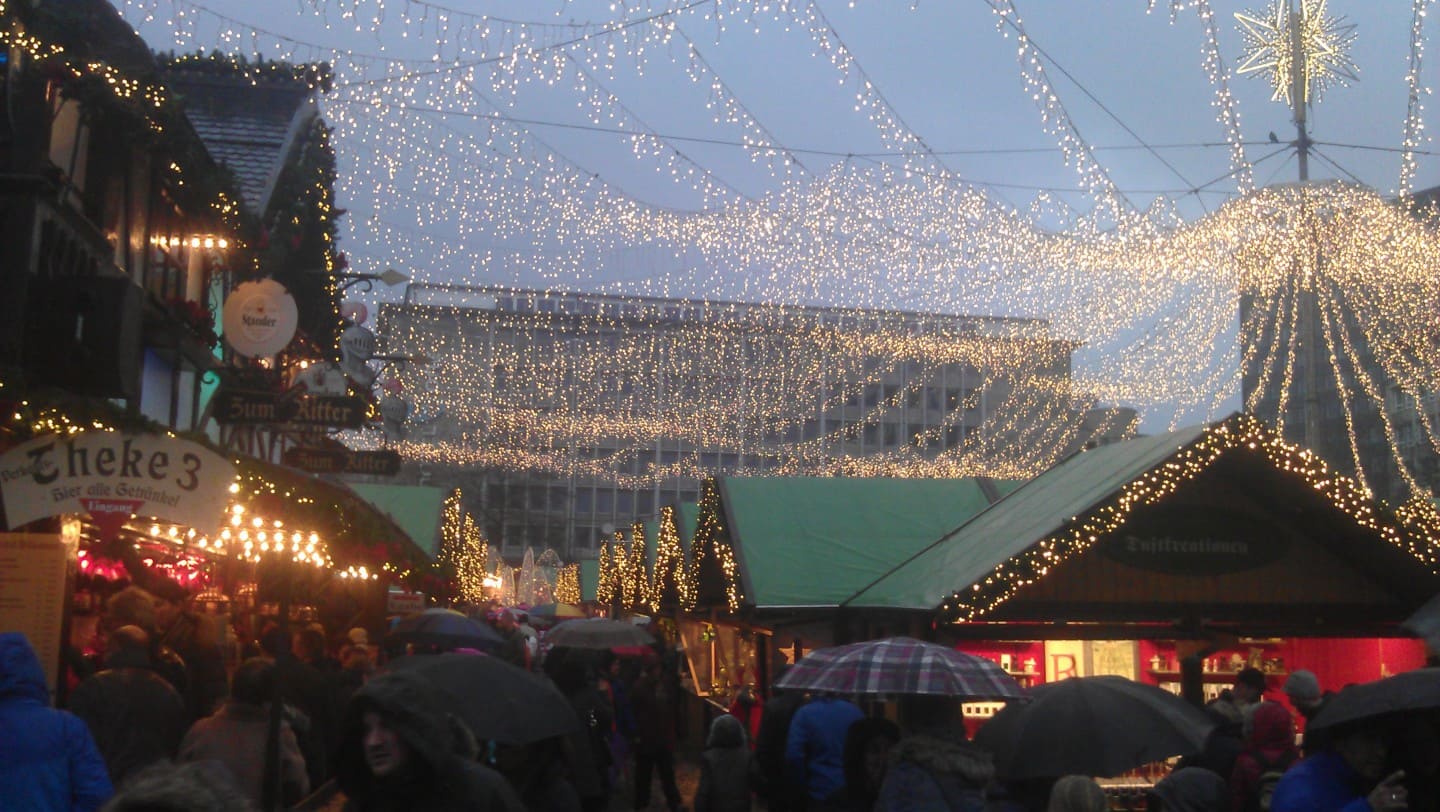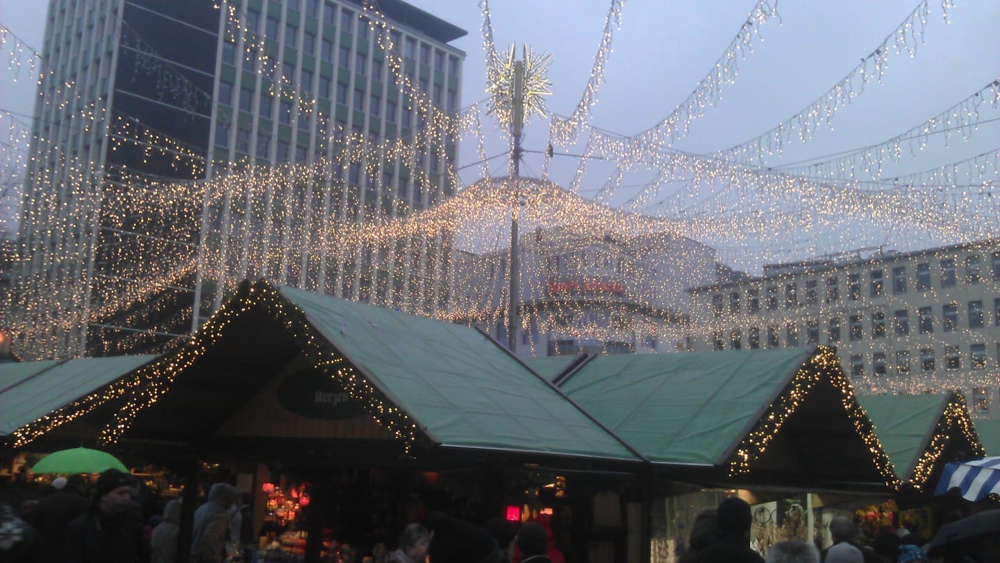 Greetings globe-trotters! The time is winding down, only 1 more week of classes left of the year, yippie!! Can you tell I’m excited ;-). In addition to working hard here in Germany this holiday season I’ve been trying to get my fix of holiday cheer by going to various Xmas markets before my awaiting winter break in Barcelona next week. This past weekend I said rain or shine I would venture to an Xmas market and the market in Essen, Germany did not fail. Even with a few raindrops here and there, it was a gorgeous display and I was delighted to see the holiday cheer on various faces of family and friends in the crowds. Take a peek below and check out the Ruhr University band as they spread holiday fun as well. Enjoy!